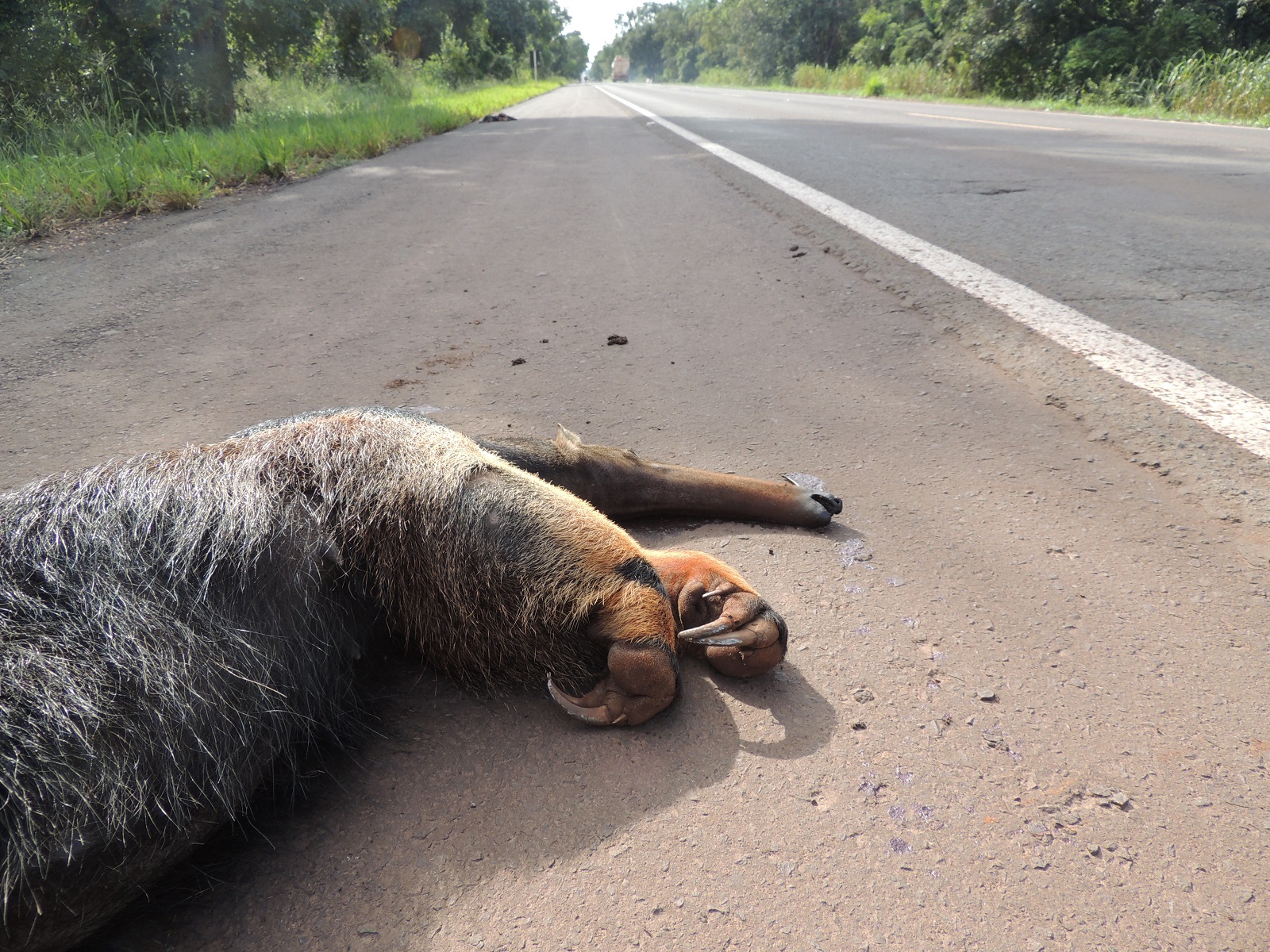 Oso hormiguero gigante atropellado en una carretera en Mato Grosso do Sul, Brasil. Foto: cortesía ICAS/divulgación