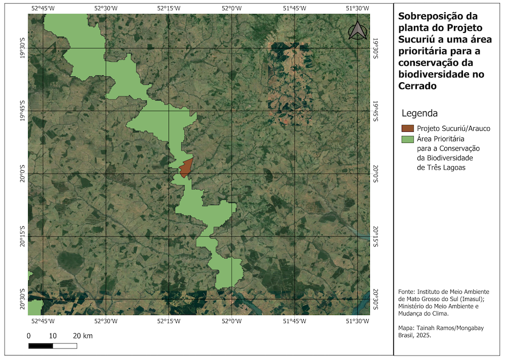 El mapa muestra la superposición del Proyecto Sucuriú, desde la fábrica de celulosa Arauco (en marrón) hasta el Área Prioritaria para la Conservación de la Biodiversidad de Três Lagoas, en Mato Grosso do Sul, Brasil (en verde claro).