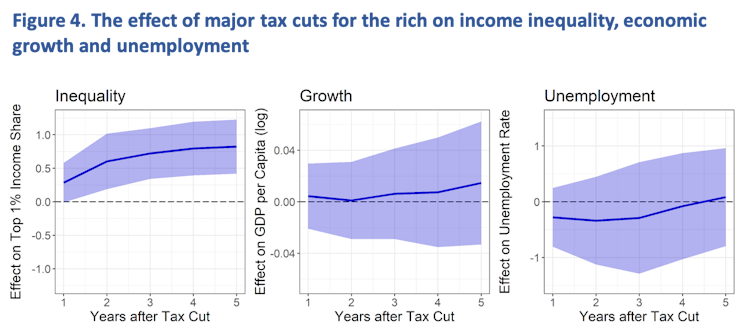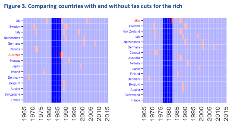 Nuestra investigación comparó países que aprobaron leyes para recortar impuestos importantes a los ricos en un año determinado con aquellos que no lo hicieron. Por ejemplo, analizamos los resultados económicos en Australia después de la reforma tributaria de 1987 y los de Estados Unidos después de los recortes de 1982, para luego compararlos con los resultados económicos en países que no recortaron los impuestos a los ricos al mismo tiempo (los resultados pueden observarse en el gráfico de abajo). Repetimos estas comparaciones para cada recorte importante de impuestos a los ricos en 18 países miembors de la OCDE entre 1965 y 2015.