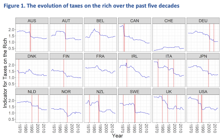 Al minuto de decidir cómo financiar la pandemia del Covid-19, los gobiernos no deberían preocuparse de que subirle los impuestos a los más ricos pueda hacer daño a sus economías. Nuestro nuevo estudio - el cual no ha sido aún revisado por pares - sobre 18 economías avanzadas muestra que cortes sustantivos a los impuestos de los ricos durante los últimos 50 años han aumentado la desigualdad, pero no han tenido ningún efecto significativo en el crecimiento económico o en el desempleo. (Revise acá el artículo de INTERFERENCIA sobre el estudio realizado por los autores).
