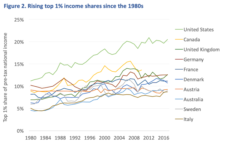 La caída de los impuestos a los ricos ha coincidido con un creciente periodo de desigualdad, especialmente en la parte superior de la distribución de ingresos a nivel nacional, como lo muestra el siguiente gráfico. Esta es una tendencia que ha sido más severa en los países anglosajones. En Estados Unidos realmente se destaca, con más de una quinta parte del ingreso nacional antes de impuestos que ahora va al 1% más rico del país.